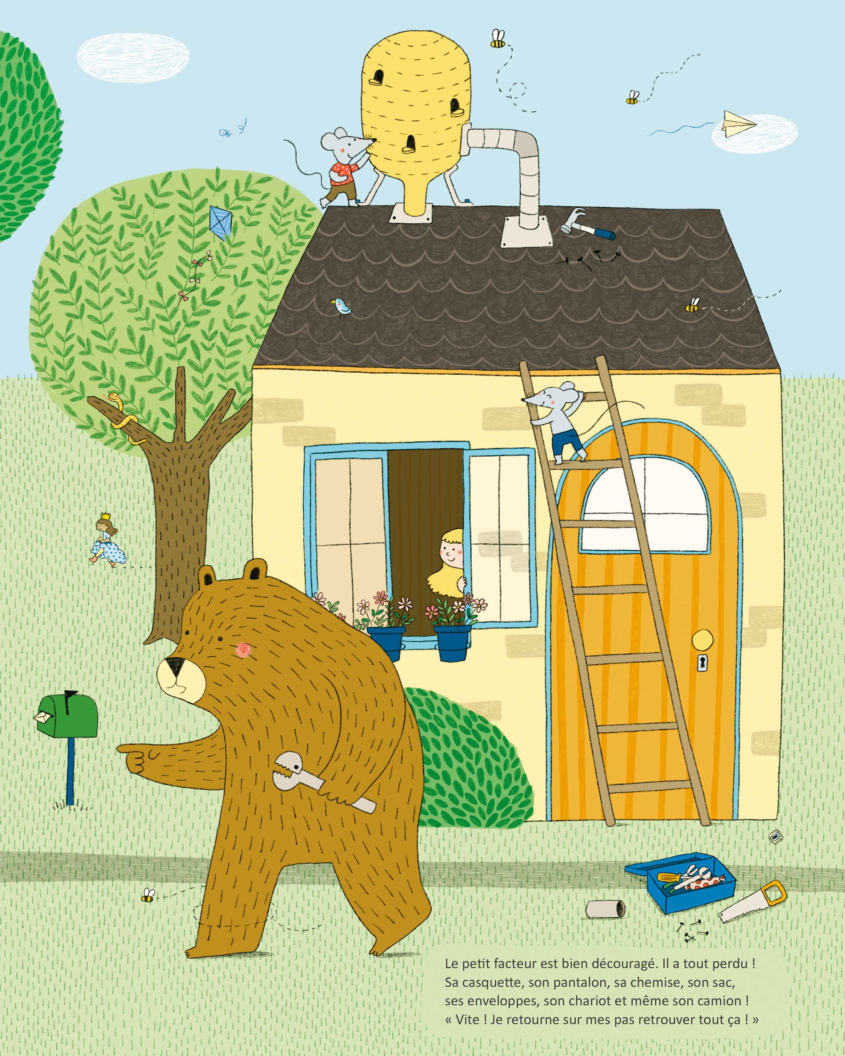 C’est la fin de la journée et Facteur Souris a fini sa tournée. Monsieur Ours a l’air surpris.